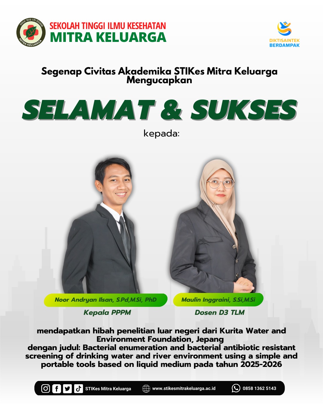 Selamat kepada Bapak Noor Andryan Ilsan, Ph.D (Kepala PPPM) dan Ibu Maulin Inggraini, M.Si (Dosen D3 TLM) atas diterimanya hibah penelitian luar negeri dari Kurita Water and Environment Foundation, Japan 🇯🇵💧.