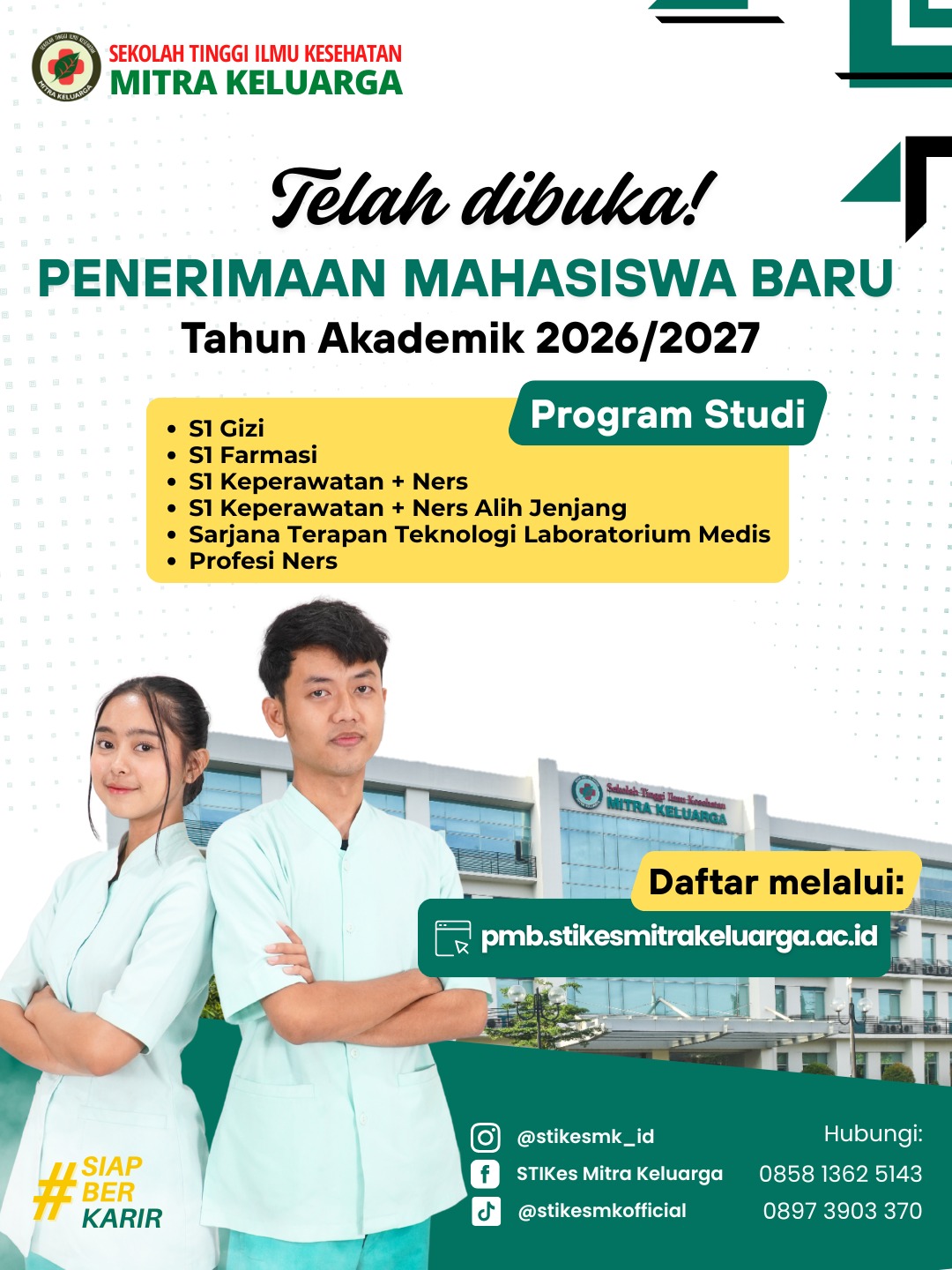 Penerimaan Mahasiswa Baru STIKes Mitra Keluarga Tahun Akademik 2026/2027 TELAH DIBUKA! Saatnya kamu melangkah menuju masa depan gemilang di bidang kesehatan! Bergabunglah bersama kampus kesehatan unggulan yang telah melahirkan tenaga profesional di bidang Keperawatan, Gizi, Farmasi, dan Teknologi Laboratorium Medis.